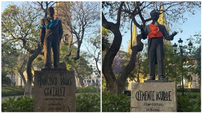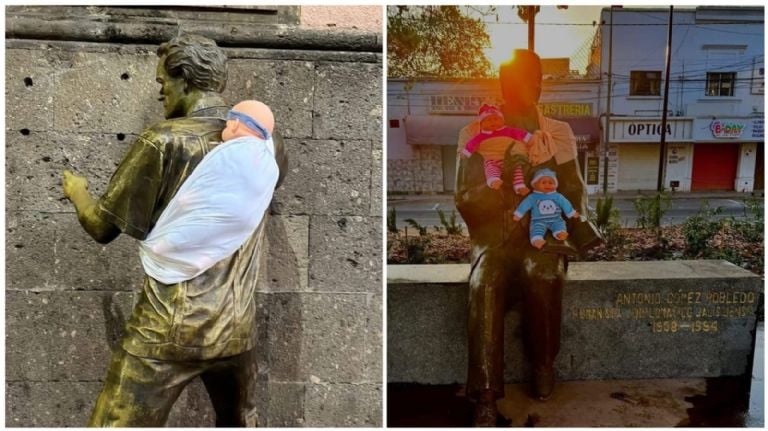 JALISCO (apro) .- Amanecieron así: con fulares de colores atados al cuerpo y muñecos de bebés sostenidos en los brazos de bronce. Las estatuas de personajes varones en el centro de Guadalajara fueron intervenidas durante la madrugada de este miércoles y, desde entonces, no han dejado de provocar preguntas.