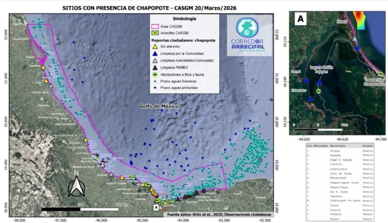 Entre los principales riesgos destacan posibles afectaciones a los arrecifes de coral del Corredor Arrecifal del Suroeste del Golfo de México, así como a los manglares de la Laguna del Ostión, los manatíes —especies bioindicadoras de la salud ambiental— y las tortugas marinas, cuyas zonas de anidación se ubican en varias de las playas contaminadas.