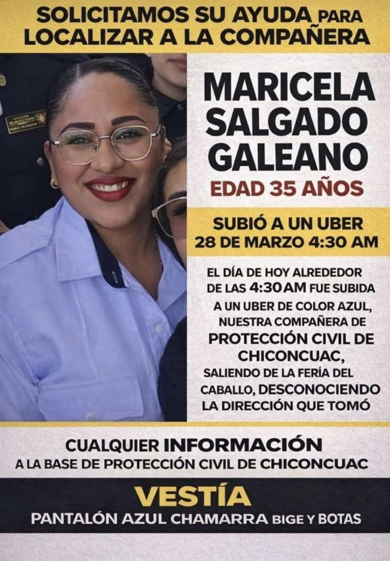 TOLUCA, Edomex (apro).- La Fiscalía General de Justicia del Estado de México (FGJEM) confirmó que elementos de la Policía Municipal de Zumpango localizaron con vida a Maricela Salgado, una mujer identificada como elemento de Protección Civil de Chiconcuac que desapareció la madrugada del pasado 28 de marzo, después de tomar un Uber a la salida de la Feria Internacional del Caballo en Texcoco.