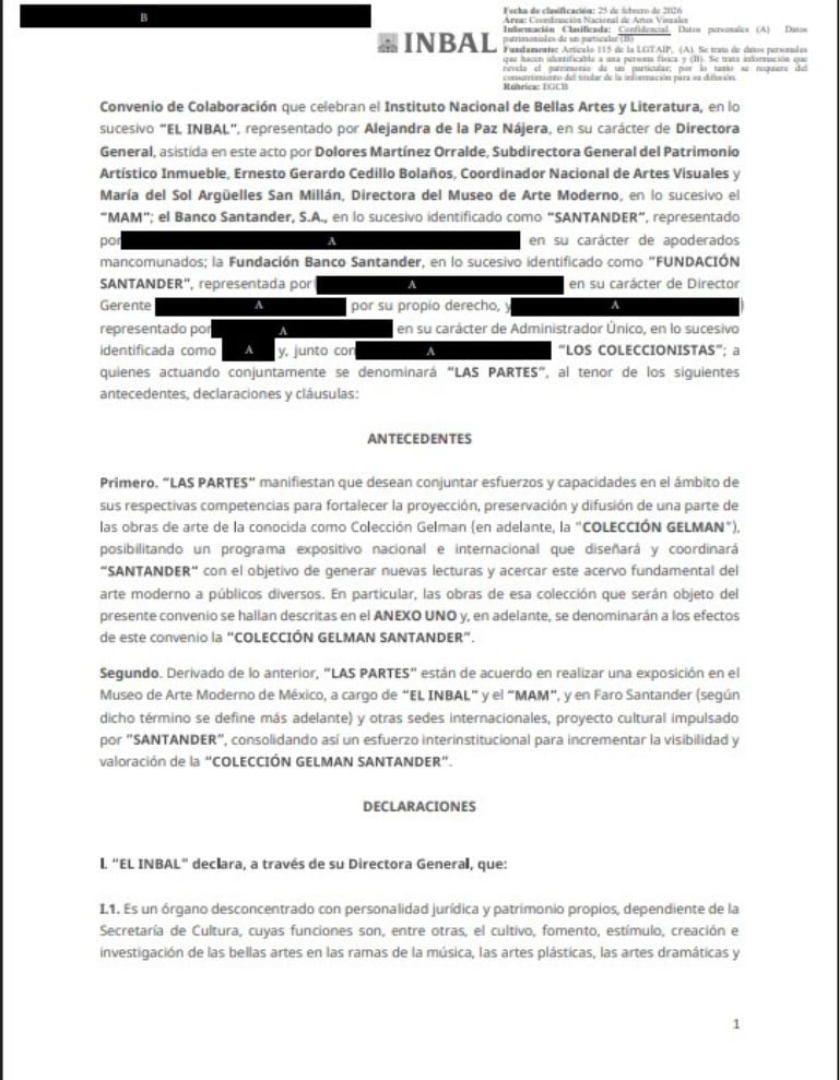 En el contrato, del cual se obtuvo una versión pública, se establece que el Instituto Nacional de Bellas Artes y Literatura y la transnacional bancaria formalizaron una colaboración “estratégica” para fortalecer la proyección, preservación y difusión de la Colección Gelman.