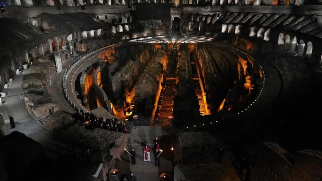 El Vía Crucis conmemora las últimas horas de la vida de Jesús, desde su condena a muerte hasta su crucifixión, muerte y sepultura. La procesión finaliza a las afueras del Coliseo, en la cima del monte Palatino.