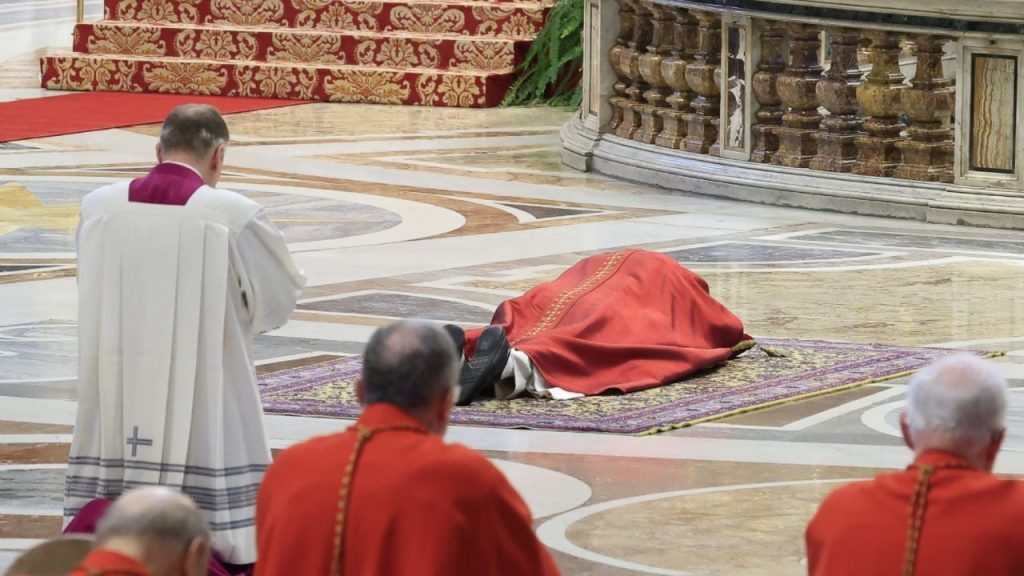 El pontífice, vestido con los paramentos rojos símbolo del martirio, empezó la ceremonia tumbado completamente sobre una alfombra ante el Altar de la Confesión, que marca el lugar exacto en el que, según la tradición, fue sepultado el apóstol Pedro.
