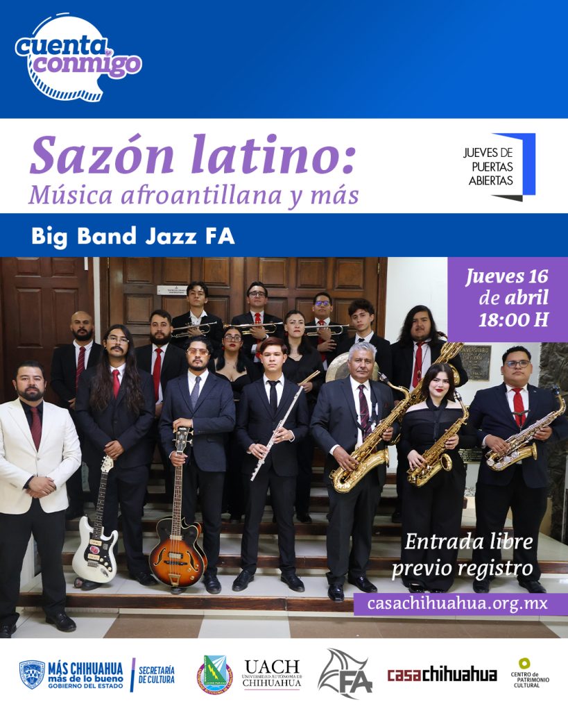 La Secretaría de Cultura, a través del Centro de Patrimonio Cultural Casa Chihuahua, invita a la ciudadanía a disfrutar del concierto “Sazón Latino: música afroantillana y más” que ofrecerá el ensamble Big Band MF, este Jueves de Puertas Abiertas.