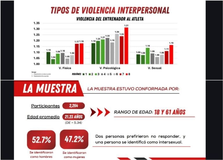La edad promedio de los participantes es de 21 años, el 53% son hombres y el 47 mujeres. A ellos se les aplicó el Cuestionario de Violencia hacia los Atletas (VTAQ), instrumento mundial de referencia para el levantamiento de este tipo de datos y que se utilizó en el resto de los países que integran el estudio.