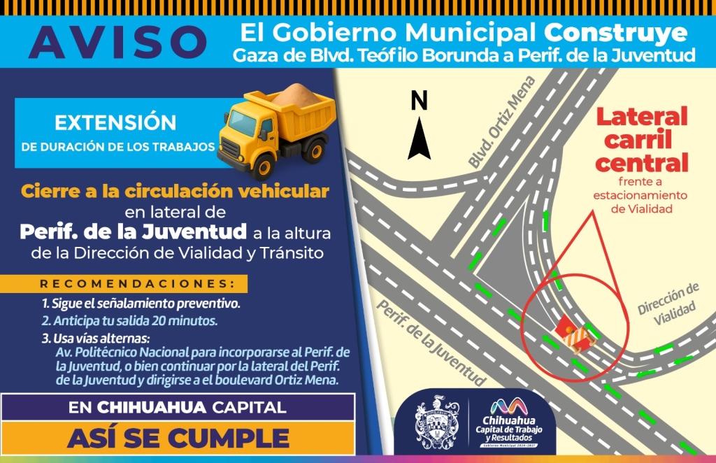 El director de Obras Públicas, Carlos Rivas, explicó que, como parte de las estrategias para agilizar los traslados de la ciudadanía, el cierre en esta zona será reajustado. Por ello, quienes utilicen la rampa de acceso de la avenida Teófilo Borunda hacia la lateral del periférico de la Juventud podrán circular con mayor facilidad, siempre respetando los señalamientos preventivos.
