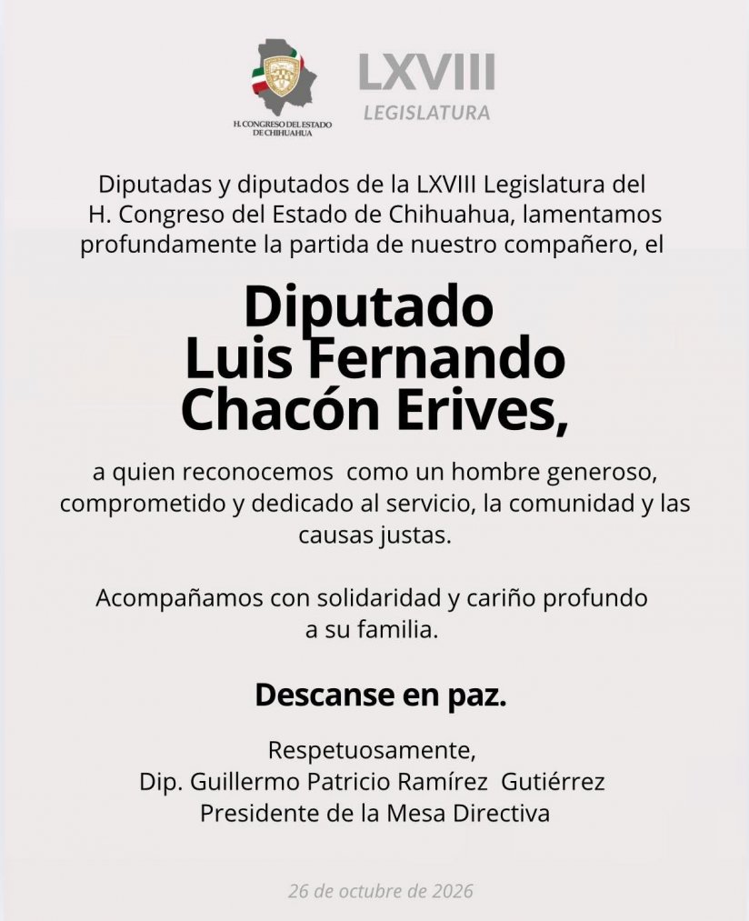 26 de octubre de 2025. Diputadas y diputados de la LXVIII Legislatura del H. Congreso del Estado de Chihuahua, lamentamos profundamente la partida de nuestro compañero, el diputado Luis Fernando Chacón Erives, a quien reconocemos como un hombre generoso, comprometido y dedicado al servicio, la comunidad y las causas justas. Acompañamos con solidaridad y cariño […]