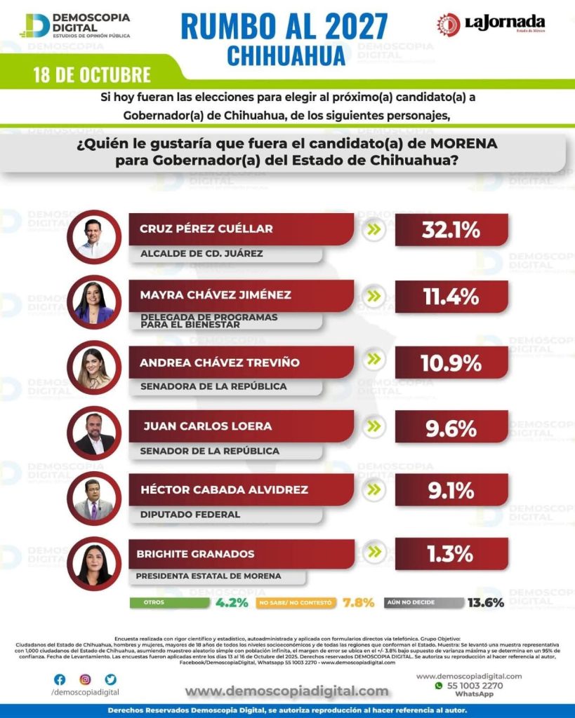 Publicidad Un nuevo estudio de opinión de Demoscopia Digital, publicado en colaboración con La Jornada, coloca al alcalde de Ciudad Juárez, Cruz Pérez Cuéllar, como el puntero en las preferencias internas de Morena para la gubernatura de Chihuahua, mientras que la delegada de Programas para el Bienestar, Mayra Chávez Jiménez, logra un importante ascenso al […]
