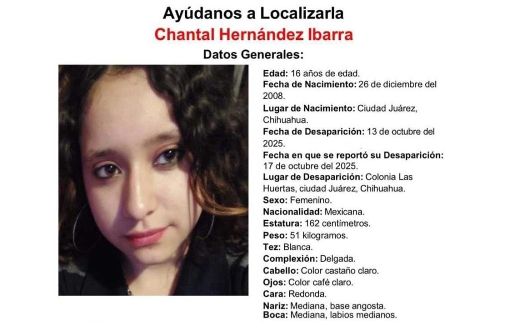 Publicidad Ciudad Juárez, Chih.– La Fiscalía de Distrito Norte emitió una pesquisa para localizar a Chantal Hernández Ibarra, de 16 años, vista por última vez el 13 de octubre en la colonia Las Huertas. La joven es de tez blanca, complexión delgada, mide 1.62 metros, pesa 51 kilogramos y tiene una perforación en el ombligo. […]