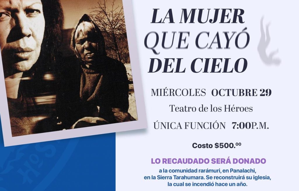 Este miércoles 29 de octubre se presenta en el Teatro de los Héroes la obra “La mujer que cayó del cielo”, cuyas ganancias se destinarán a la reconstrucción de la iglesia del Sagrado Corazón de Jesús, ubicada en Panalachi, municipio de Bocoyna. La función inicia en punto de las 19:00 horas y los boletos tienen […]