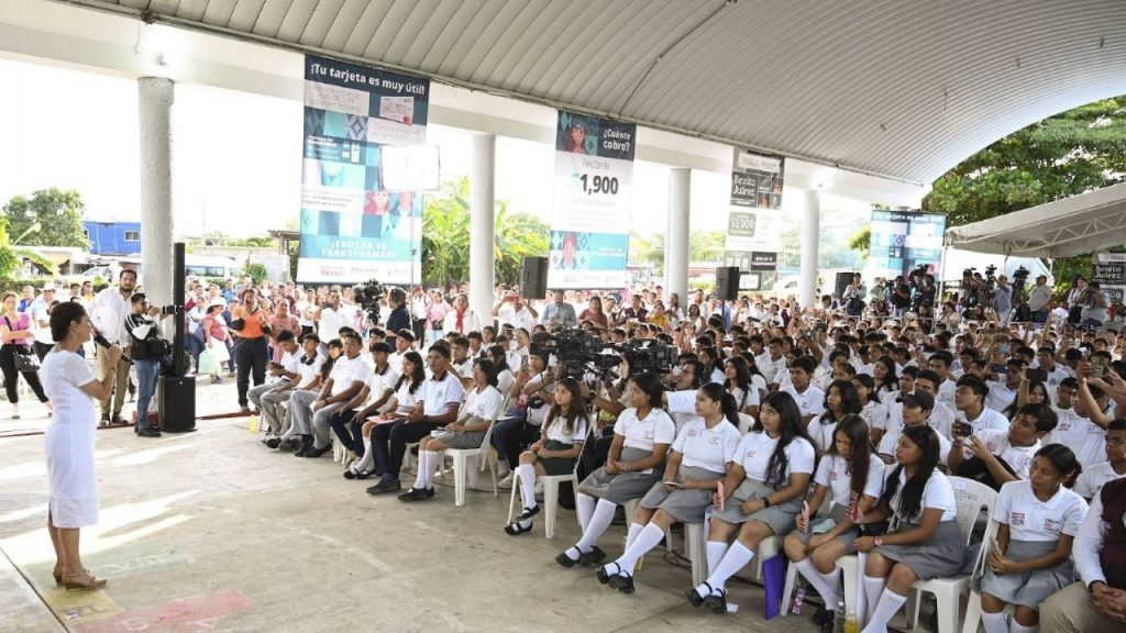 “Nunca hay que utilizar la violencia para cambiar, siempre por la vía pacífica”, dijo la presidenta durante la entrega de tarjetas a beneficiarios de las Becas Benito Juárez en Tabasco.